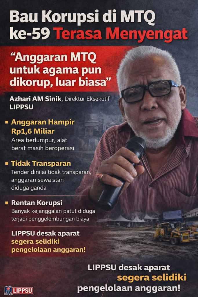MEDAN – Lembaga Independen Pemerhati Pembangunan Sumatera Utara (LIPPSU) menyoroti keras pelaksanaan Musabaqah Tilawatil Qur’an (MTQ) ke-59 Kota Medan yang dinilai sarat kejanggalan. Direktur Eksekutif LIPPSU, Azhari AM Sinik, menyebut aroma dugaan korupsi dalam kegiatan tersebut “terasa menyengat”.