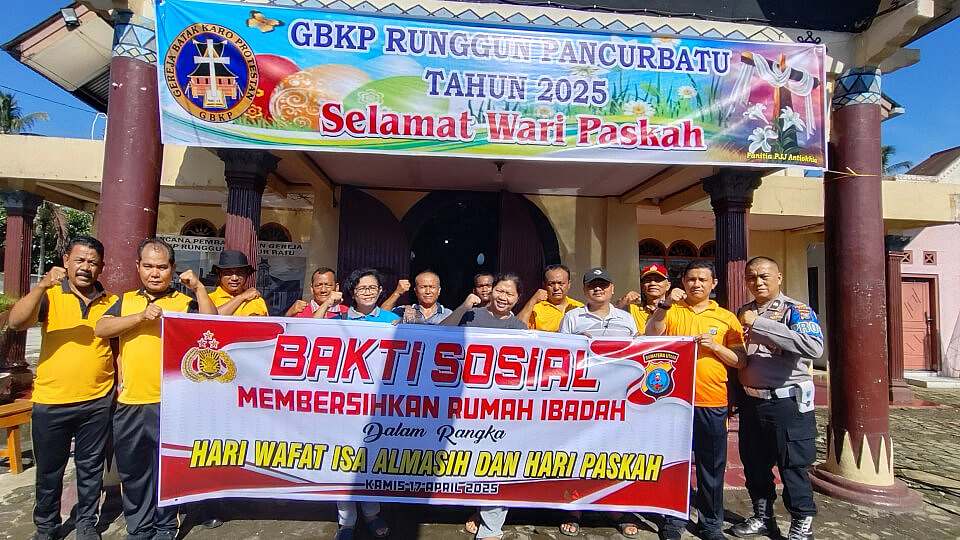 PANCUR BATU – Polsek Pancur Batu melaksanakan kegiatan bakti sosial berupa pembersihan tempat ibadah dalam rangka hari wafatnya Isa Almasih atau hari Paskah di Gereja GBKP Jalan Jamin Ginting Desa Hulu Kecamatan Pancur Batu Kabupaten Deli Serdang Kamis 17 April 2025.